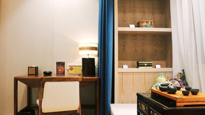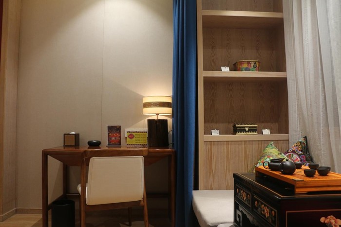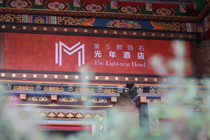 第5颗陨石·光年酒店”这边整个建筑装修风格都是藏族特色设计,包括转经筒、金刚结、木雕、摆件、家具等,就像在一个藏文化艺术馆一样。