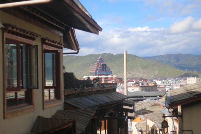 在远处看过去,松赞林寺就像耸立在半山腰一样。金色的屋顶非常醒目哦。期间吃了这边的特色游客饭,顶饱又美味。