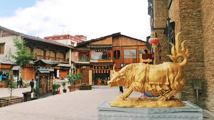 行走在独克宗古城,总会发现很多特别之处。比如这只象征着幸运的大金牛,金光闪闪,很威风哦,闪到我的眼睛。看来第一天的古城闲逛,确实收获不少!