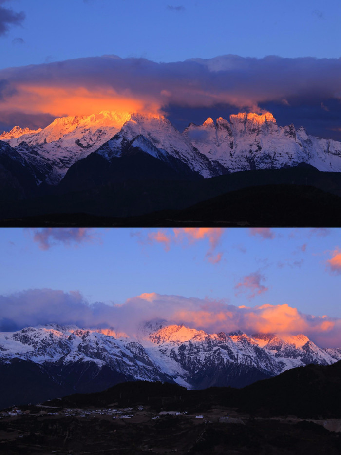 为了不错过日照金山,闹钟定了6点,7点就去看了日照金山,冬天天气都很好,梅里雪山空气干燥,宁静寒冷,我们就在梅里雪山对面看到了日照金山。太子十三峰就是梅里雪山,它是云南的第一高峰,太阳光照耀下来金子般闪耀的雪峰,下面是模糊不清的山体的沉睡的村落,连同头顶湛蓝的苍穹,感觉一切眨眼间就会破碎,纯美到虚幻