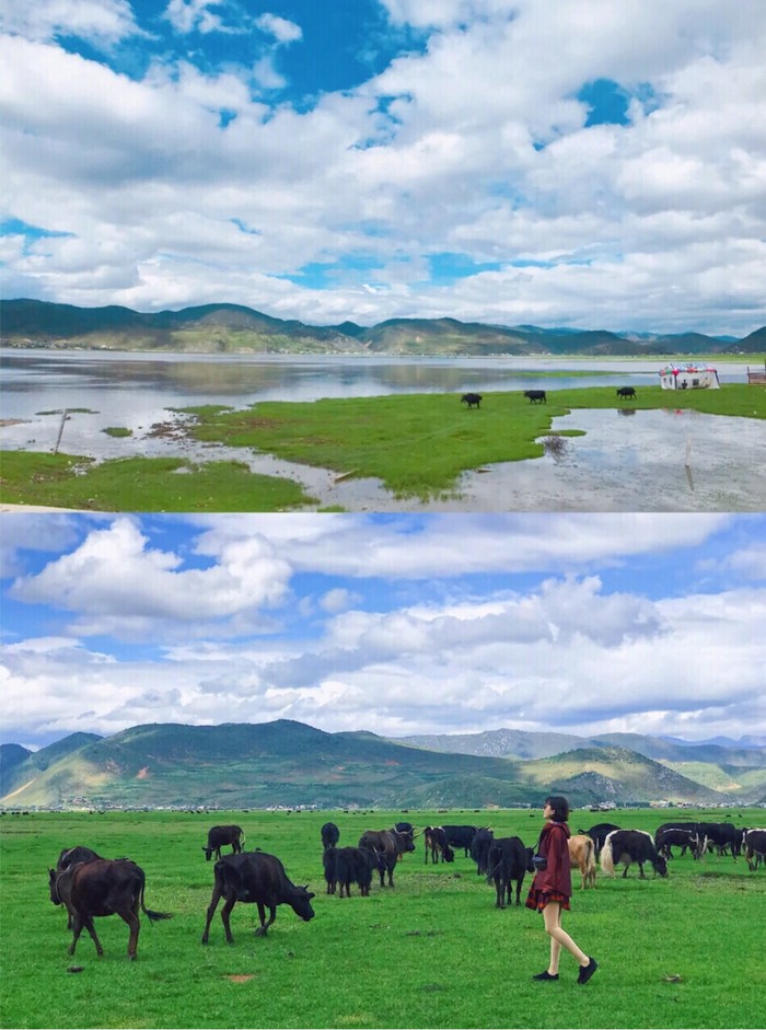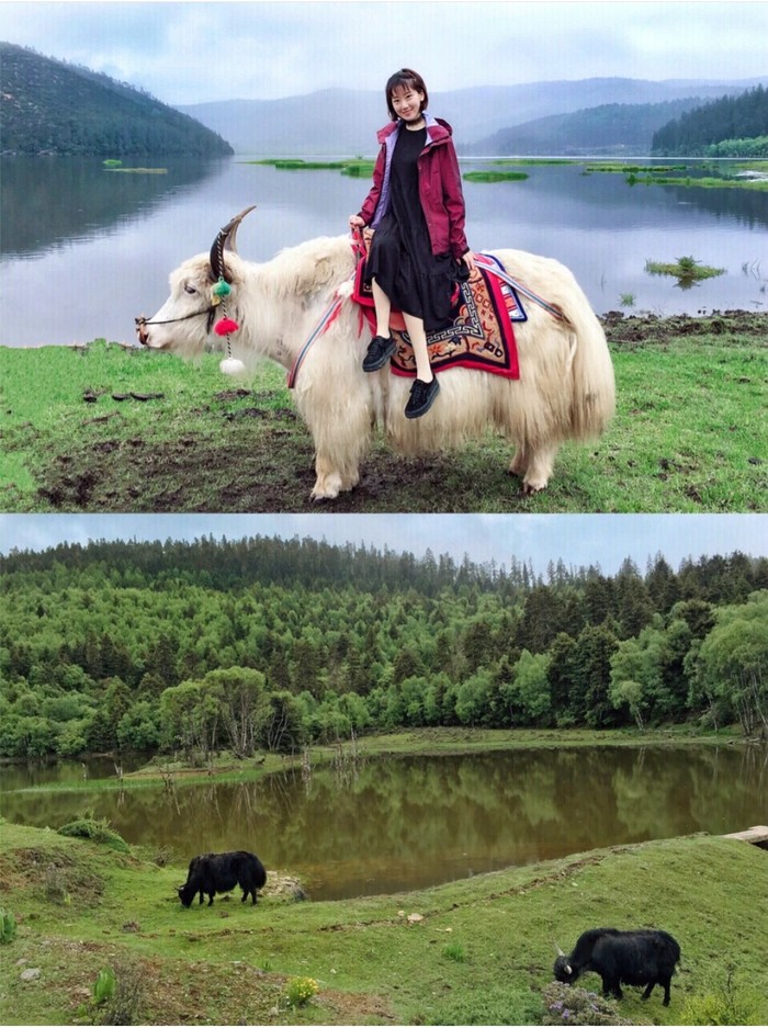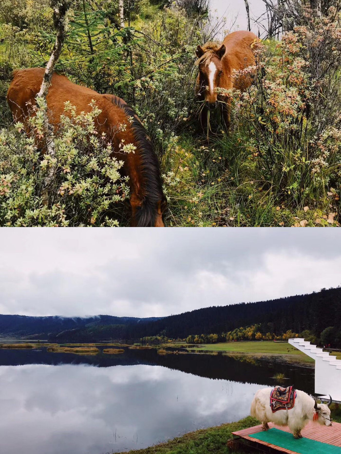 第四天返程回香格里拉,打卡了普达措森林公园,普达措是香格里拉两日游必打卡景点,强烈推荐,一年四季都很美!途中会偶遇成群的牦牛在河畔山间游荡。