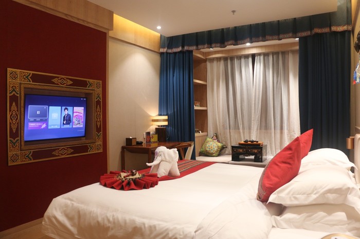在酒店的大堂和宽敞的房间里,随处都可以看到转经筒、金刚结等藏文化里寓意吉祥的幸运之物,木雕、摆件、家具、挂饰等也都是独具匠心的藏文化元素。这海拔3300米的有氧奢华!对于我们这些不常造访高原的游客来说,这简直太nice啦!