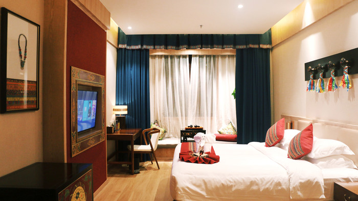 酒店最深的印象是充满藏族风情,一间房间,床上折成小象的毛巾,精致的转经筒,一下就心生欢喜……