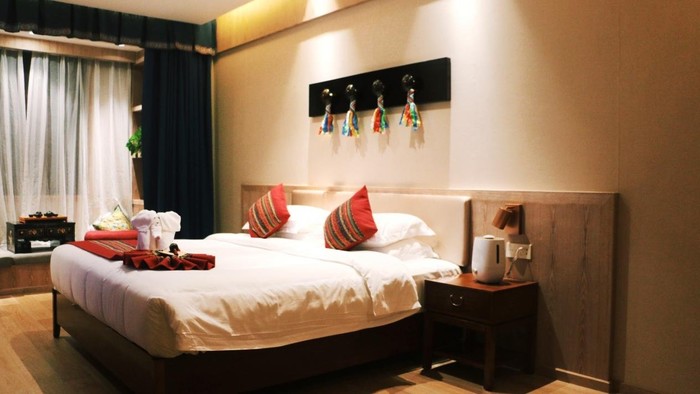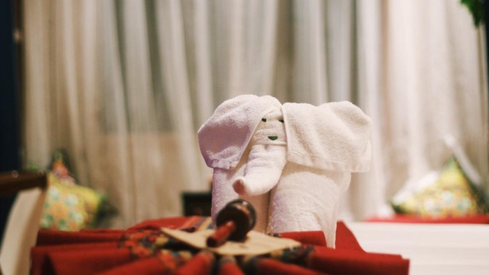 细节方面也很走心,床上有毛巾折的小象和小型的手摇转经筒,既凸显了当地特色又不显违和,真是可爱极了。