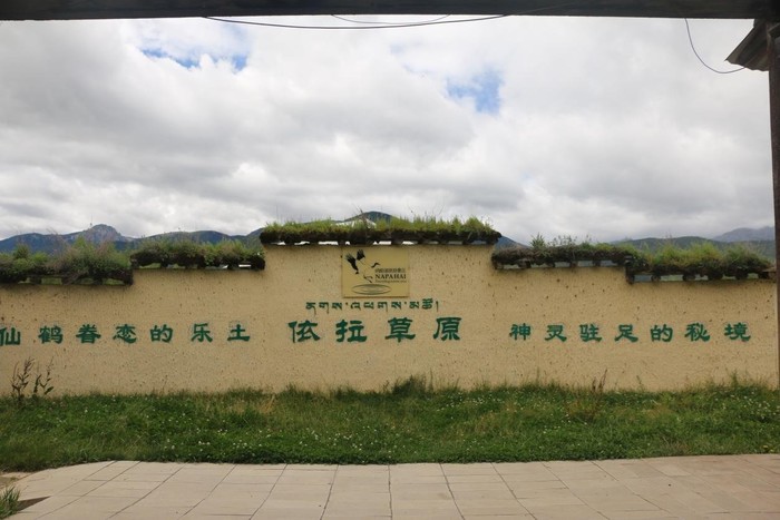 草原入口处的矮墙上写着“仙鹤眷念的乐土,神灵驻足的秘境”。原来每当秋季来临,许多飞禽便会光顾这里,各种水鸟在灌林中"啾啾"地鸣叫着,有红嘴鸥、斑头雁、麻鸭。高原珍禽黑颈鹤也从青藏高原的腹地飞来这里过冬,它们若无其事地生活在牧人的帐房旁边,构成非常和谐的自然景观。
