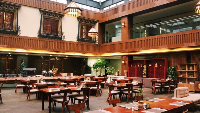 露天食堂也特别棒,感觉有点像古时候的戏园子。桌椅餐具都很有讲究,和那种商务酒店完全不一样,格外有特色。
