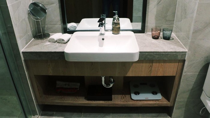 住酒店最关注的就是卫生问题。而洗浴间的卫生最能显示一家酒店的卫生安全程度。他们家的洗浴间非常干净整洁,而且东西都很齐全,一看就让人很放心。除了标配的毛巾水杯洗手液之类的以外,还有电子秤和小梳妆镜,非常贴心。