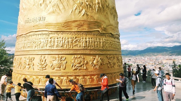 这里有世界最大的转经筒。它位于龟山公园,你几乎在古城的各个角落都能看到它。但是真正走近才能感受到它的震撼。转经筒上面刻有六字真言,是藏传佛教中念诵经文的一种方式,每转动一次就相当于念诵经文一次,是一种虔诚的信仰。有很多人都在转,我也去跟着转了几圈。