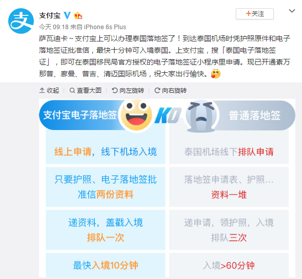 今早支付宝官宣:“支付宝上可以办理泰国落地签啦!
