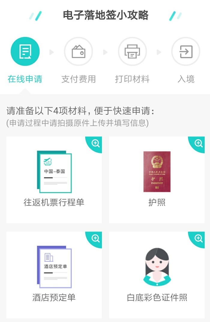填写到达泰国时间、到达机场,就可以开始申请,所需材料有往返机票行程单、护照、酒店预定单、白底彩色证件照。