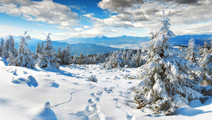 林海雪原——大片积雪覆盖的原始森林,连绵到远方的天际。