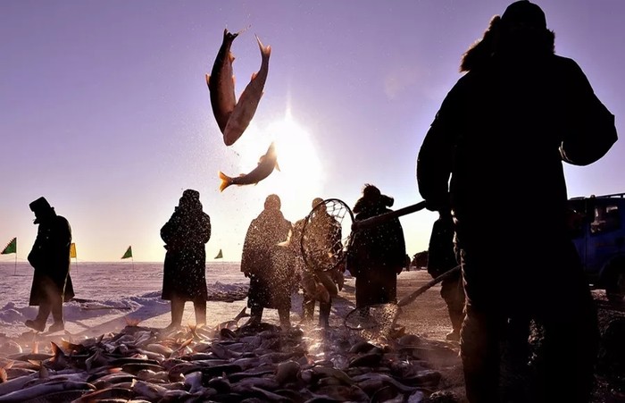 抵达【镜泊湖南湖头冰上基地】,开始玩【冰上保龄球】以及【冬捕】项目,乘坐东北冰面特有的交通工具【网红雪圈车】