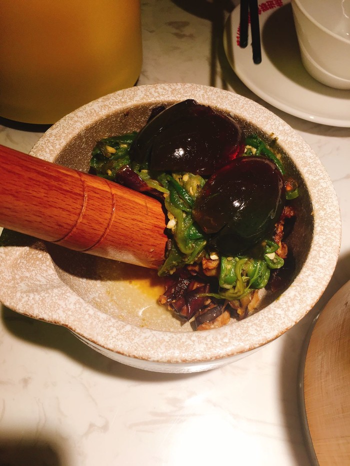 皮蛋辣椒擂茄子,好吃!!!不怎么辣,就是有丢丢油,味道可以滴,反正我是很喜欢啦