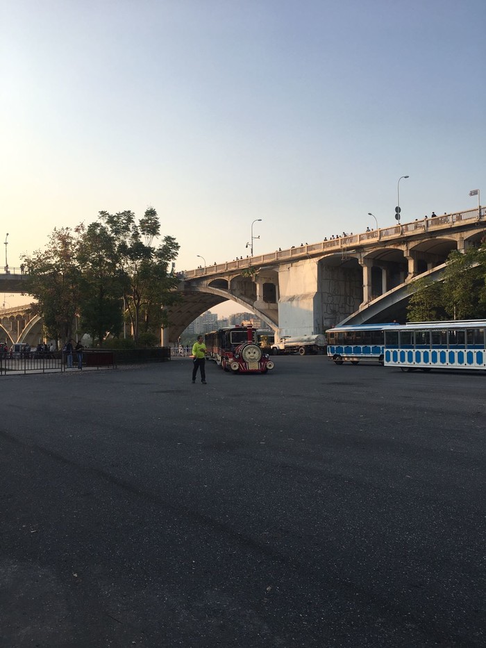 然后就去橘子洲头了,广场那边有地铁,直接去那里很方便的,到橘子洲头大概有四点多了,我们都很懒,去坐观光车了,在公众号上买票,要不排队人很多,但是!!!!排队坐观光车的人巨多!!!人多的让我想起了香飘飘的广告。。。。。。如果你有钱你可以选择包车大概四五百吧……公众号上也可以买包车,邮轮。