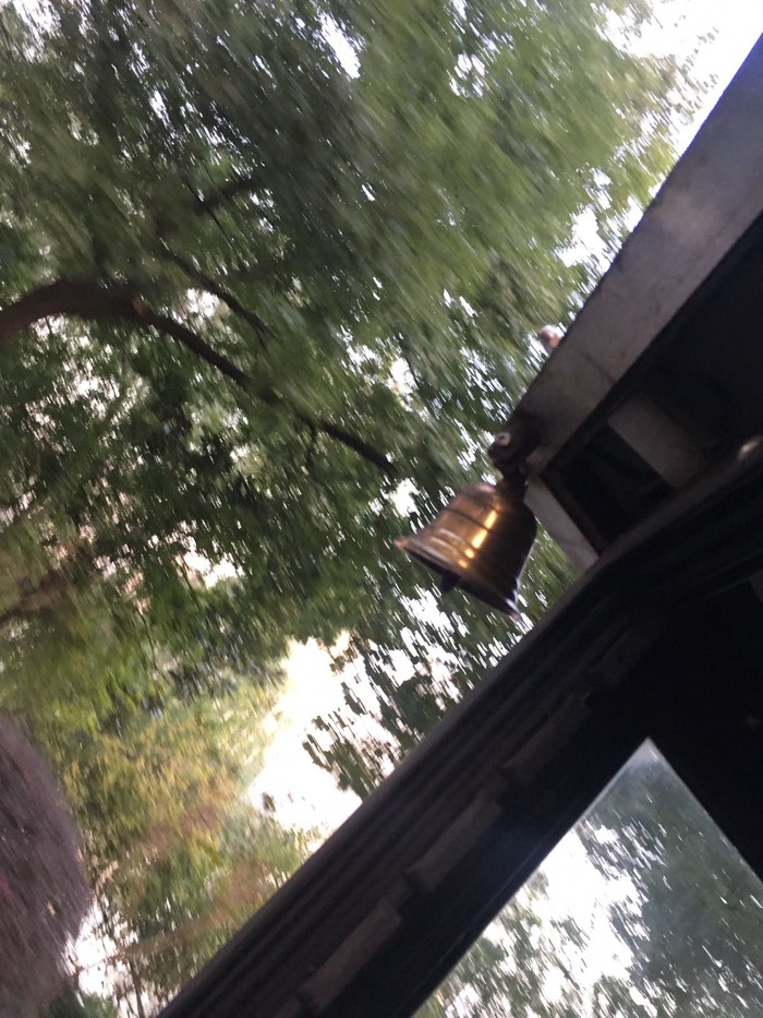 我们仨坐在车厢最后一排,有小铃铛陪伴