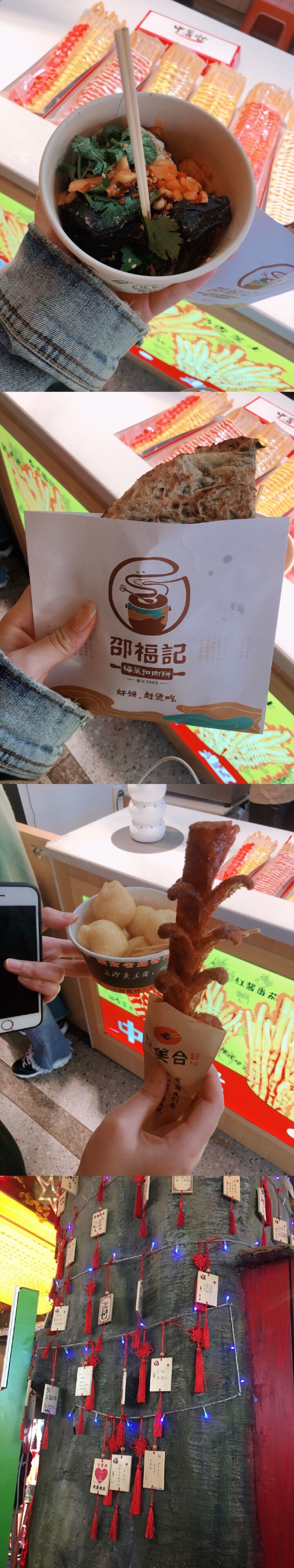 有一丝丝的甜,但是又没有猪肉的那种腻,口感又是那种脆脆的,总之按我闺蜜的话说跟阿甘锅盔有的一拼!!价格不记得了跟薯条是一家总共才二十几块吧!我闺蜜给我买了臭豆腐,说实话不是网上推的那家,就是庙街普普通通的一家,吃的人还不少,不过味道还不错,要了辣椒,刚炸出锅的臭豆腐,浇上酱汁,加上辣椒、咸菜,大蒜和香菜,第一口,嗯~不错,各种料混在一起,加上脆脆的口感,OMG,good!不臭,在嘴里能感受到臭豆腐的那种香