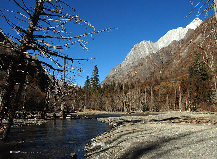 参观完后接着往四姑娘山进发,最多一个小时到达四姑娘山镇上。建议住在城区里,吃饭和购物比较方便,特别是三嫂家旁边超市卖的牛肉干现在想着都回味无穷。可沿着河边散步,不过这个季节比较冷,还是早早在铺盖里呆着吧。