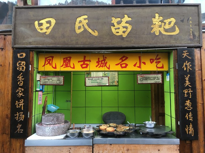 「田氏苗粑」临着沱江,门面不大,看起来不大起眼,但却标榜着"古城名小吃"的名头,店主说他的苗粑是古城内最正宗的。
