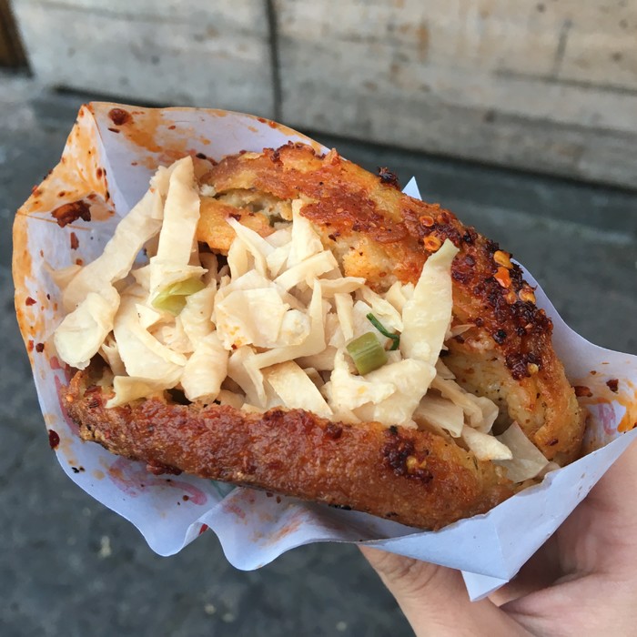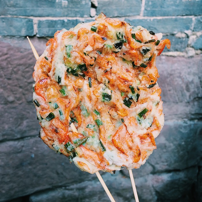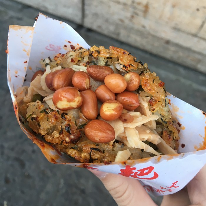 抱着"人生贵在尝试"的心态我们买了一份,emmm怎么说呢,味道还是不错的,外壳焦香,应该是用糯米之类做成的,内馅丰富可以自己搭选,只不过我俩都不太喜欢外壳的口感,觉得过于硬了些,如果你喜欢煲仔饭那种灵魂饭焦或许会喜欢这份苗粑~