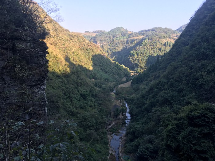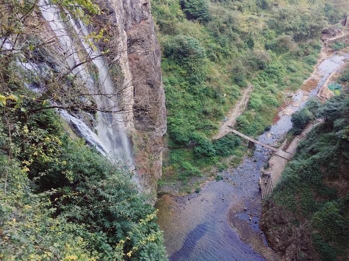 站在一点都不吓人的玻璃栈道上望飞水瀑布)