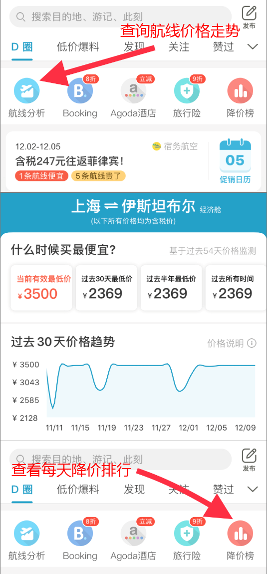 除了特价机票,D圈还上线了两个重磅功能:降价榜、航线分析!