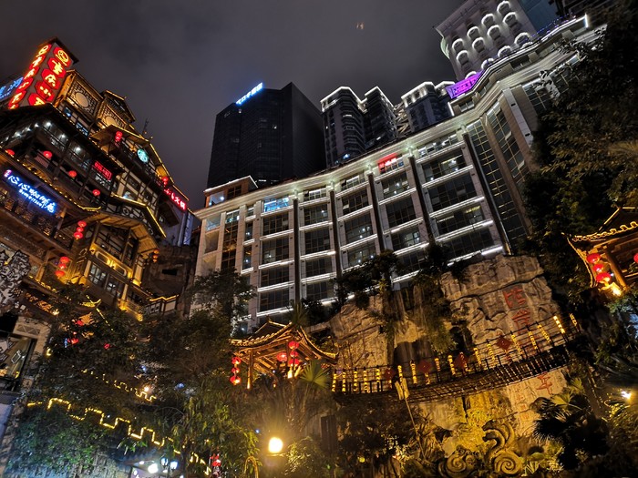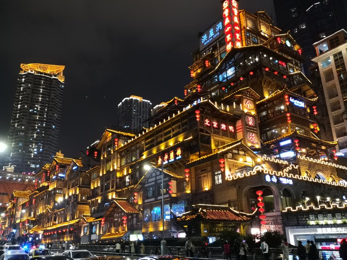 夜色正浓,打卡洪崖洞。一簇簇游人都是向着这个方向而去,途中经过猴三老火锅和瓜西西火锅,两家店挨着,门口坐满了等位的人。过了马路就是洪崖洞,进去就是11层,要一直向下走,下面都是卖东西的店铺,一般的旅游产品,商业气息浓重,传统与现代碰撞后留下的,便是这依山就势,沿江而建的,具有巴渝传统建筑特色“吊脚楼”风貌的建筑。拍照的话还是到路对面,能看到洪崖洞的夜景。要是想拍全景,可以到千厮门大桥上,或者坐两江夜游的船。
