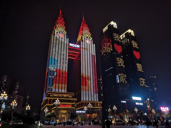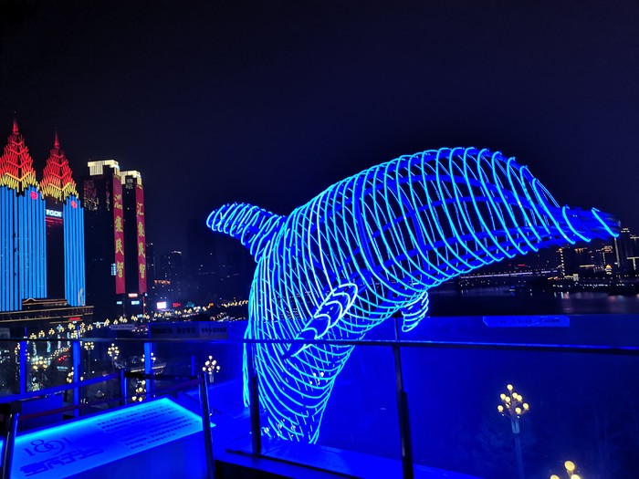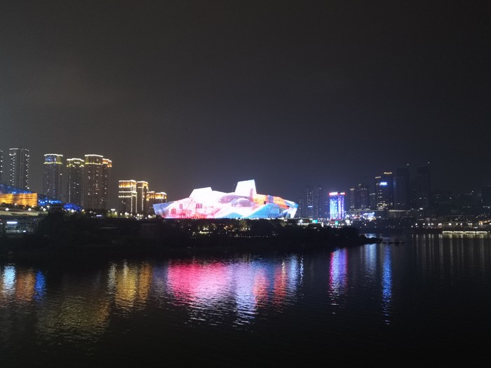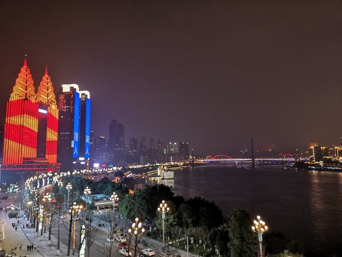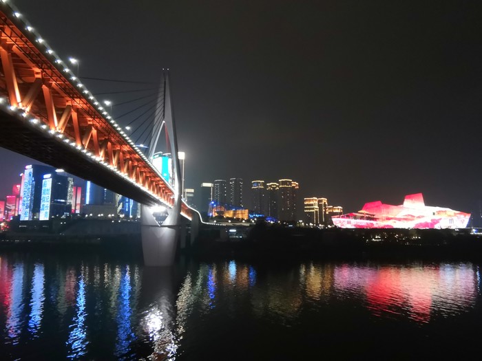沿江而行,洪崖洞的灯光魔幻璀璨,映红了江水,照亮了夜空。游客熙熙攘攘走走停停,只为记录美景。夜晚更能展示重庆的5D绚烂,灯光变化,千厮门大桥、重庆大剧院、沿江建筑都被披上靓丽的颜色,闪耀着炫目的光芒。