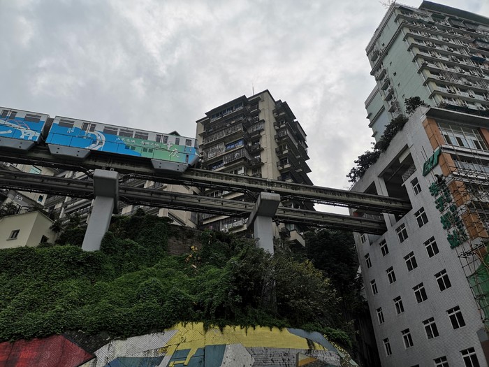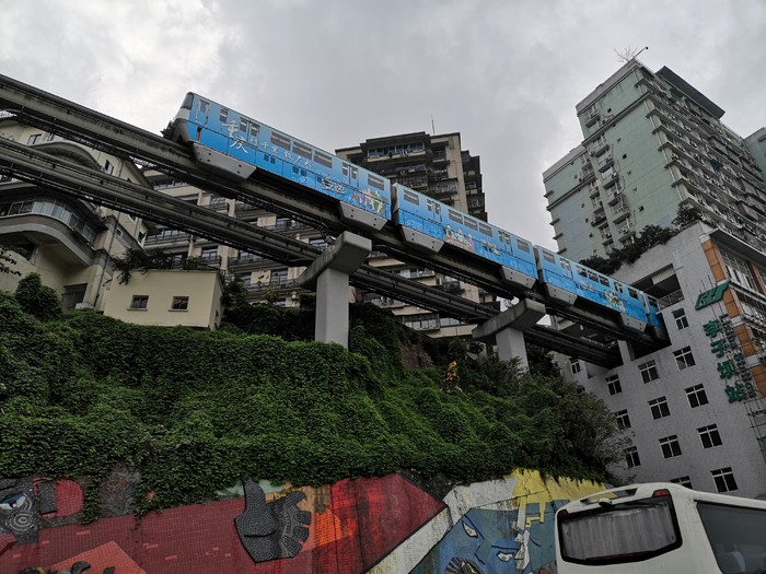 第二天,先去网红的轻轨穿楼。轻轨2号线到李子坝站,出站可到观景平台拍照,轻轨每隔3分钟一趟,可以慢慢拍。