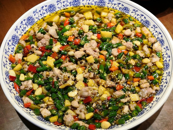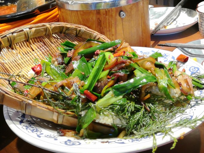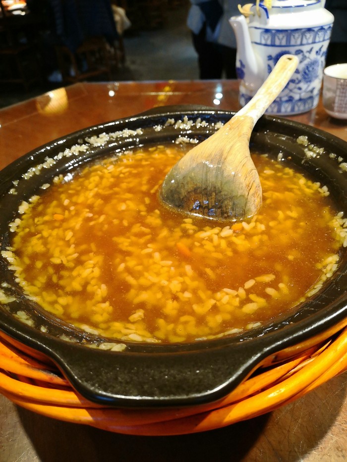晚餐在杨记隆府,招牌是辣子鸡和民国霸王兔,基本上每桌必点,看着辣子鸡里红彤彤的辣椒,我只好选择霸王兔了。虽然是微微辣,实际上还是又麻又辣,味道真的很好。柏枝锅巴腊肉,有松柏枝垫底,锅巴脆而不腻,腊肉咸香入味。红糖阴米粥甘甜可口,回味无穷。