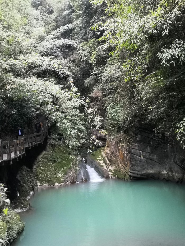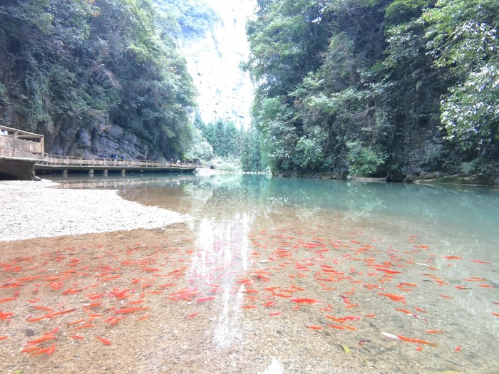 龙泉洞的泉水流入一汪碧池,红色的鱼群密集地涌在岸边徘徊。前面还有很长一段台阶,步行要20分钟,可以坐观光车,票价15元/人,省时省力。出了天生三桥景区,一直走便是龙水峡地缝景区,需要单独购票85元/人(含电梯和观光车)。