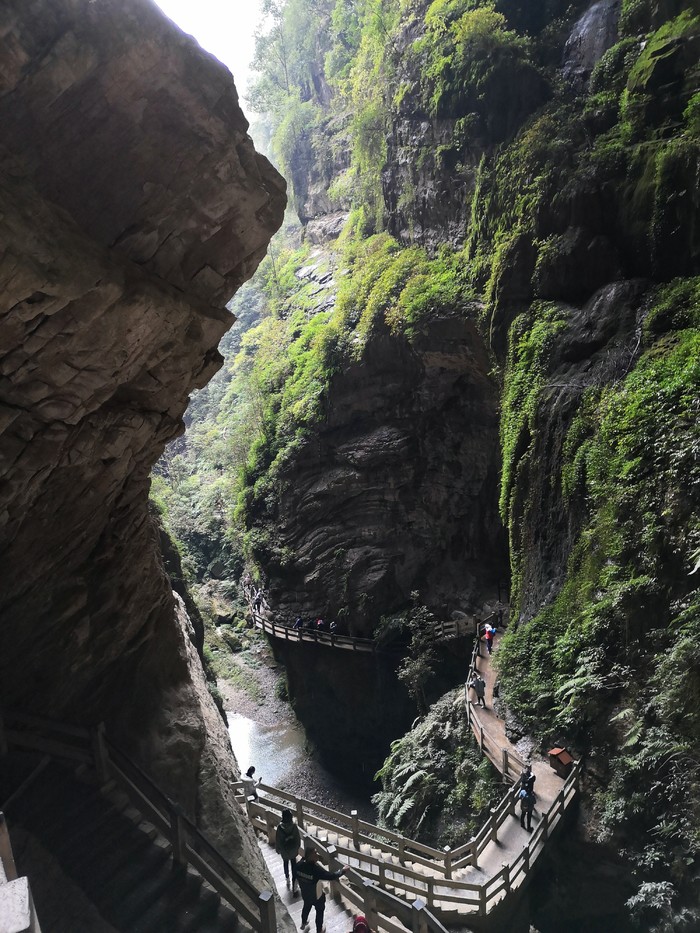 乘坐电梯直达数十米深的平台,顿时开阔别有洞天。一路沿石阶而下,周围壁立千仞,远处人行如蚁。