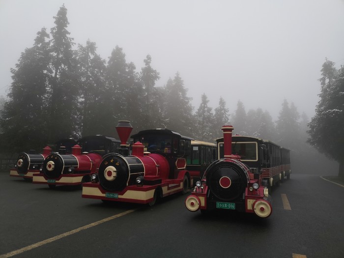 第四天早上,到游客中心乘客运车前往仙女山。一路盘山,越往山上走雾越大,能见度也就几米,沿途可见未化的积雪。车程40分钟,终于到达仙女山国家森林公园。门票50元/人,观光小火车25元/人。