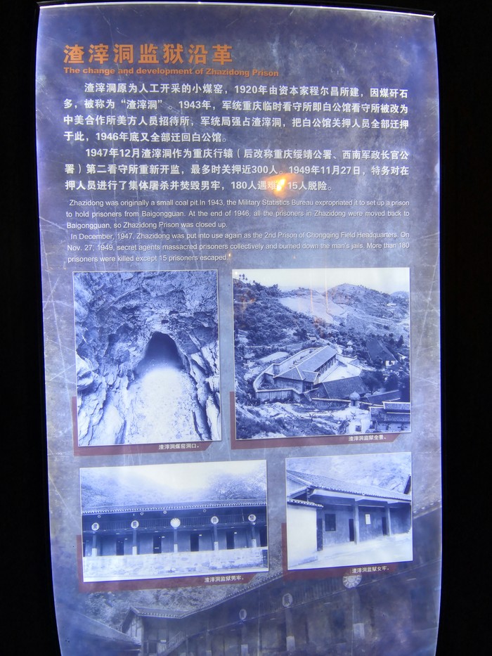 从白公馆步行20分钟便来到渣滓洞,原是重庆郊外的一个小煤窑,因渣多煤少而得名。渣滓洞三面是山,一面是沟,位置较隐蔽,后成为关押革命者的牢房,最多时关押近300人。