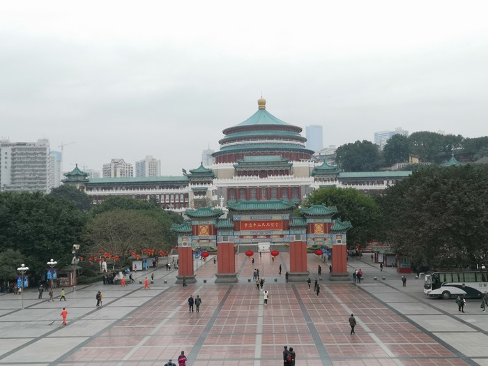 重庆三峡博物馆、人民广场与人民大礼堂三位一体,在同一中轴线上,人民大礼堂仿北京天坛,是重庆独具特色的标志建筑物之一。