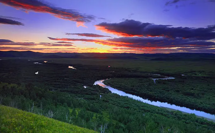 根河湿地被誉为“亚洲第一湿地”,清澈的根河水静静流淌,岸边矮树灌木丛生,山间白桦林连绵成片,这里地形平缓开阔,登上山坡顶后俯视整个湿地全景