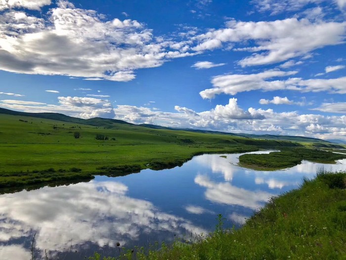 莫日格勒河号称”天下第一曲水”,河道十分狭窄,极度弯曲,但其弯曲程度,用九曲十八弯来形容是远远不够的。在这里游玩适合就是发呆,放空自己,静静地感受风吹过触摸肌肤的清凉,看天上的云朵自由的飘荡,牛羊在草原上悠哉地觅食,拿起相机随手一拍都是摄影大片。