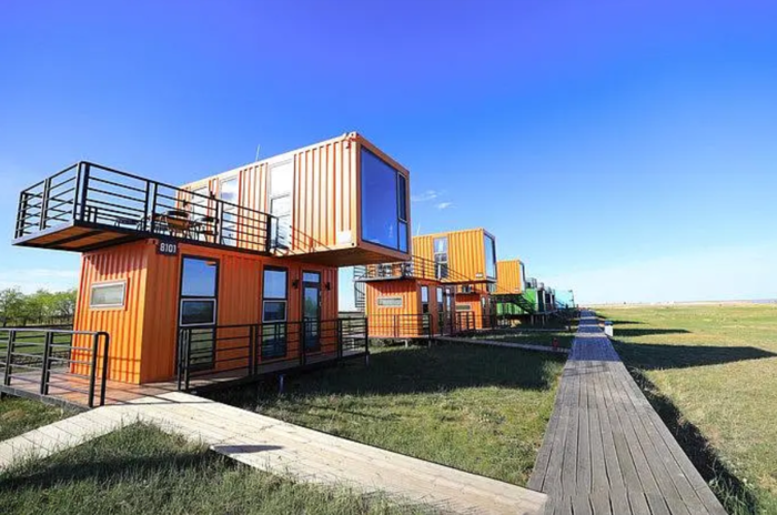 (6)集装箱酒店集装箱通常作为运输工具为人们所熟知,而现在作为一种建筑材料,集装箱也受到了建筑师以及客户们的欢迎。世界各地各种造型的集装箱酒店纷纷呈现在世人眼前,独特的建筑造型与建筑风格让人眼前一亮,带来与众不同的旅行体验,也为传统的建筑注入了新的元素和生命力。位于草原深处的集装箱酒店,颜色艳丽的工业风集装箱与水天一色的贝尔湖自然景观形成强烈的视觉反差,室内采用美式工业风格装修,简洁舒适,营造一流的睡眠环境。站在落地窗前,贝尔湖美景一览无余,晨观壮阔日出,夜览云海落霞,伴璀璨繁星入睡,闻鸟鸣蛙声而醒,在这片最纯粹的天地中感受自然之美。在夜晚与至爱亲朋一起仰望星河,体验工业与自然相结合,硬派与柔顺相冲撞带来的享受。