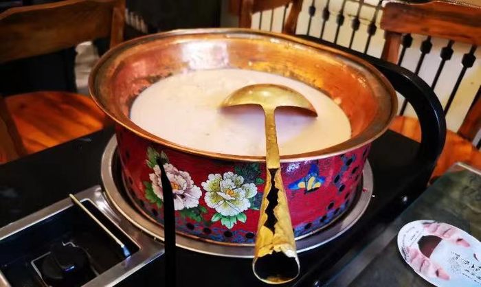 (2)蒙古锅茶对我们蒙古人来说,奶茶早已不是单纯意义上的饮品,而是一种文化的传承,一种情感。锅茶主要先用传统的方法将奶茶熬好,只后加入风干肉、奶酪、奶皮子等在锅中边吃边煮。吃的时候将奶茶盛在碗中,加上奶豆腐和炒米,再和黄油混在一起。越往后炒米和奶豆腐泡的越软,味道口感及好。喝的时候再配上一些蒙古果子,牛排等,那就更显正宗了。