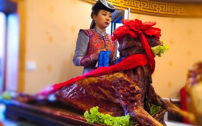 (5)烤全羊烤全羊是一道极贵重的菜肴,一般出现在很隆重的场合,比如那达慕,蒙族婚礼,长生天祈福等盛大节日,其工序非常简单,但并不是每位厨师都能够尝试的,将整一直处理好的肥羊放入炉中烘烤,再填入其他佐料,烤成外皮金黄,内部绵软即成,吃的时候直接配上当地的野韭菜花酱即可。去哪吃:巴尔虎蒙古部落、金帐汗蒙古草原部落、黑山头手指羊牧场推荐菜:整只烤全羊、血肠、羊肚、配菜