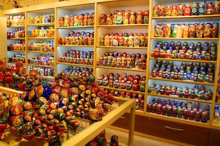 (5)俄罗斯套娃是俄罗斯特产的木制玩具,一般由多个一样图案的空心木娃娃一个套一个组成,最多可达十多个,通常为圆柱形,底部平坦可以直立。颜色有红色,蓝色,绿色,紫色等。最普通的图案是一个穿着俄罗斯民族服装的姑娘,叫做“玛特罗什卡”,这也成为这种娃娃的通称。这种套娃做工很精美颜色搭配也很鲜艳,摆在家里是很好看的工艺品,送给小朋友他们也会十分喜欢的哦!