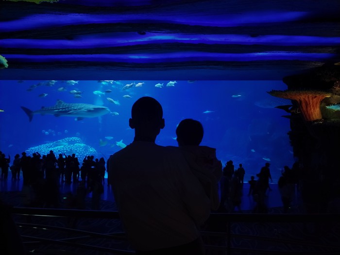 入园后一定要先领地图和演出时间表。因为带着小孩所以我们就进门从左手边开始按照地图逛,印象最深的是飞鸟世界和鲸鲨馆。这里的动物种类很多,而且会有灵性,有些小可爱会和人互动。因为好多娱乐项目都要求孩子在1米或是1米2以上,所以我们看了5D电影坐了海底互动船,剩余就是按照顺序看,给孩子讲。晚上园内有花灯的巡演,巡演结束后有水上飞人+烟花秀+无人机灯光秀
