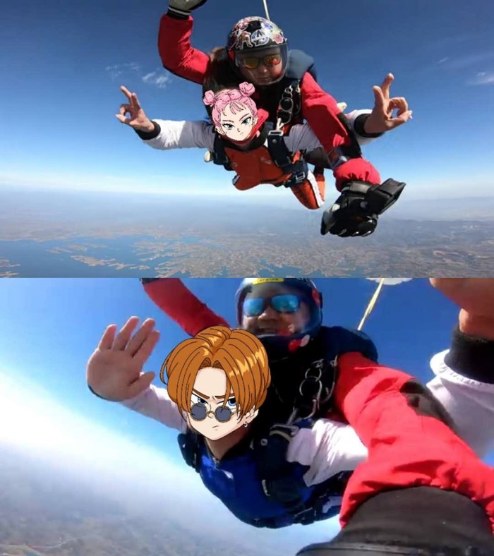 我个人是没有恐高症的,过山车跳楼机没什么问题,但是我的男票还是有点畏高的。所以当他在我前面跳的时候啊啊啊啊啊啊地乱叫真的没把我笑死。在地面等待的时侯也是上了两三躺厕所。从出发到上飞机,全程面部紧绷,尤其是在机舱里,满脸苦笑加便秘脸。