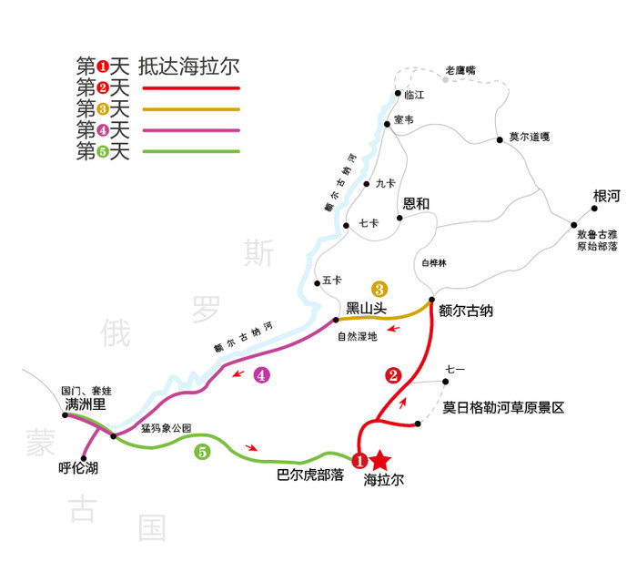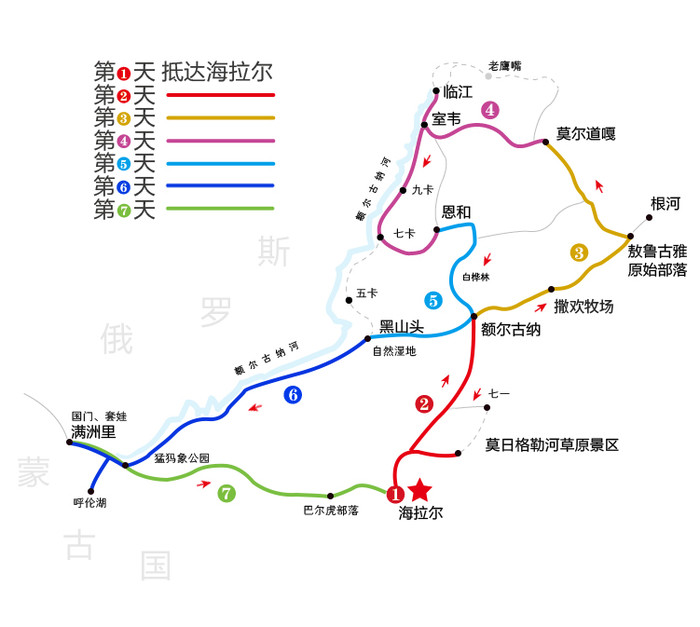 海拉尔-恩和--莫尔道嘎-漠河-北极村-根河-黑山头-满洲里-海拉尔