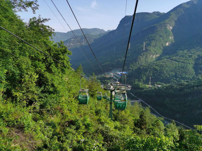 接着就可以上山,有两种上山方式:①可以乘坐索道上山。在山中穿行。②可以走路上山,在山中行走,不会感到炎热,反而能体验到凉意。作为一个常年缺乏锻炼的人。我当然选择的是乘坐缆车上山,随着缆车慢慢上升,我的视野也逐渐变得宽广起来,第一次坐这种缆车,心里还是很害怕的。全程都不敢怎么抬头。(石锤:胆小鬼)