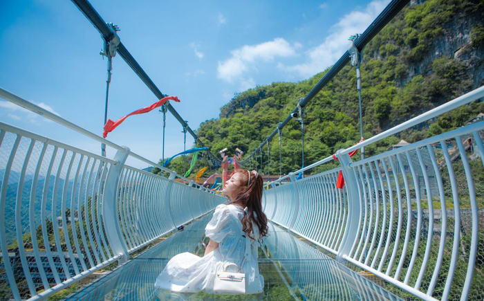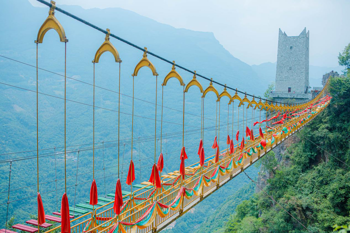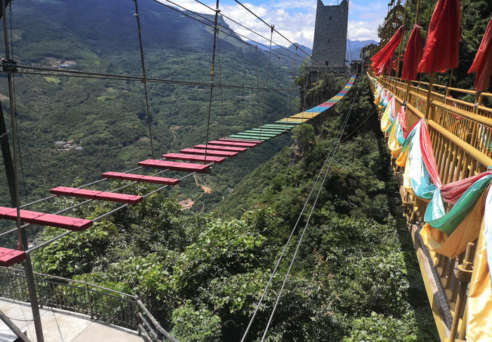 之前就听过玻璃桥,站在桥上,真是能体会杜甫笔下的:会当凌绝顶,一览众山小。喜欢拍照的朋友,一定不能错过这个景点。蓝天、白云、羌寨、山川在此全部融为一体。让人一时忘却生活的烦恼,此时只沉浸于这美景中。作为有恐高的人来说,主要不看脚下,走起来还是很轻松的。一看脚下真是寸步难移。