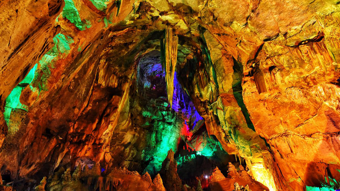 .走进猿王洞,夏天的炎热已完全抛之脑后了,洞中的钟乳石经过大自然的雕琢,在彩灯的照耀下美不胜收,水中倒影清晰,仿佛置身于另一个世外桃源。