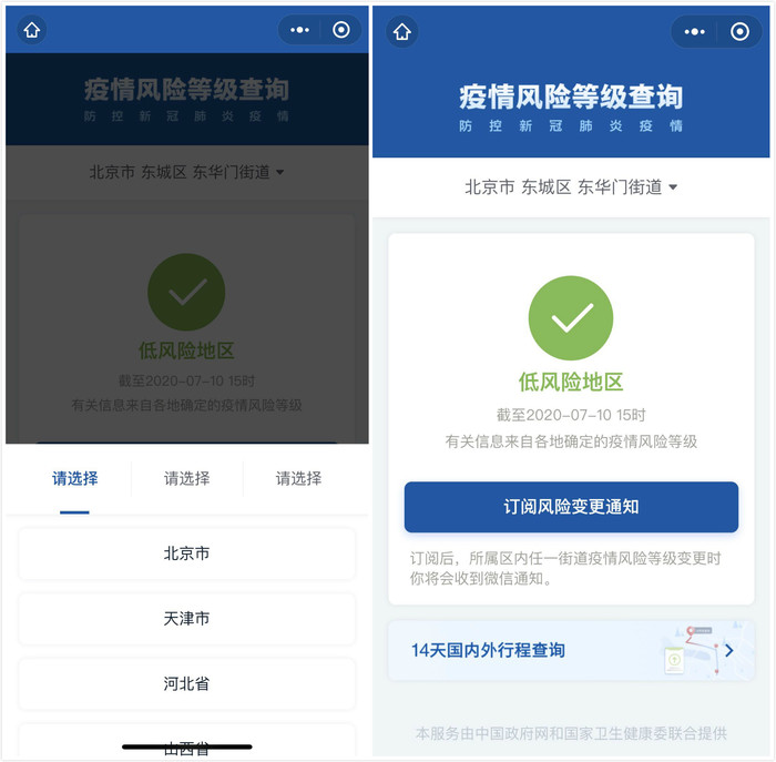 点击主页「疫情风险查询」,进入后选择地区即可查看结果。