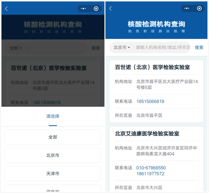 点击主页「核酸检测机构」,进入后选择地区即可查看结果。