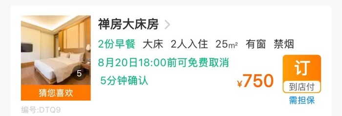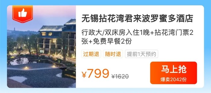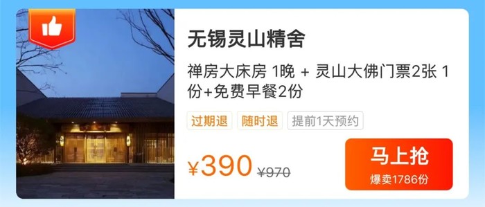 携程上平时同店同房型住晚1380元,现在购买套餐几乎便宜一半!而且还送价值110元的拈花湾门票2张!怪不得已卖出2000+份,果然是血赚啊!