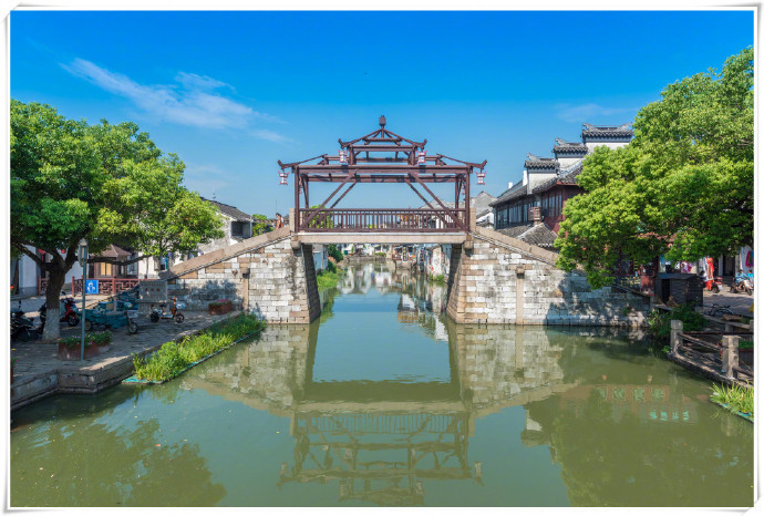中国最美的十大古镇之一“同里古镇”位于江苏省苏州市吴江区,宋代建镇。镇区内始建于明清两代的花园、寺观、宅第和名人故居众多,“川”字形的15条小河把古镇区分隔成七个小岛,而49座古桥又将其连成一体,以“小桥、流水、人家”著称。